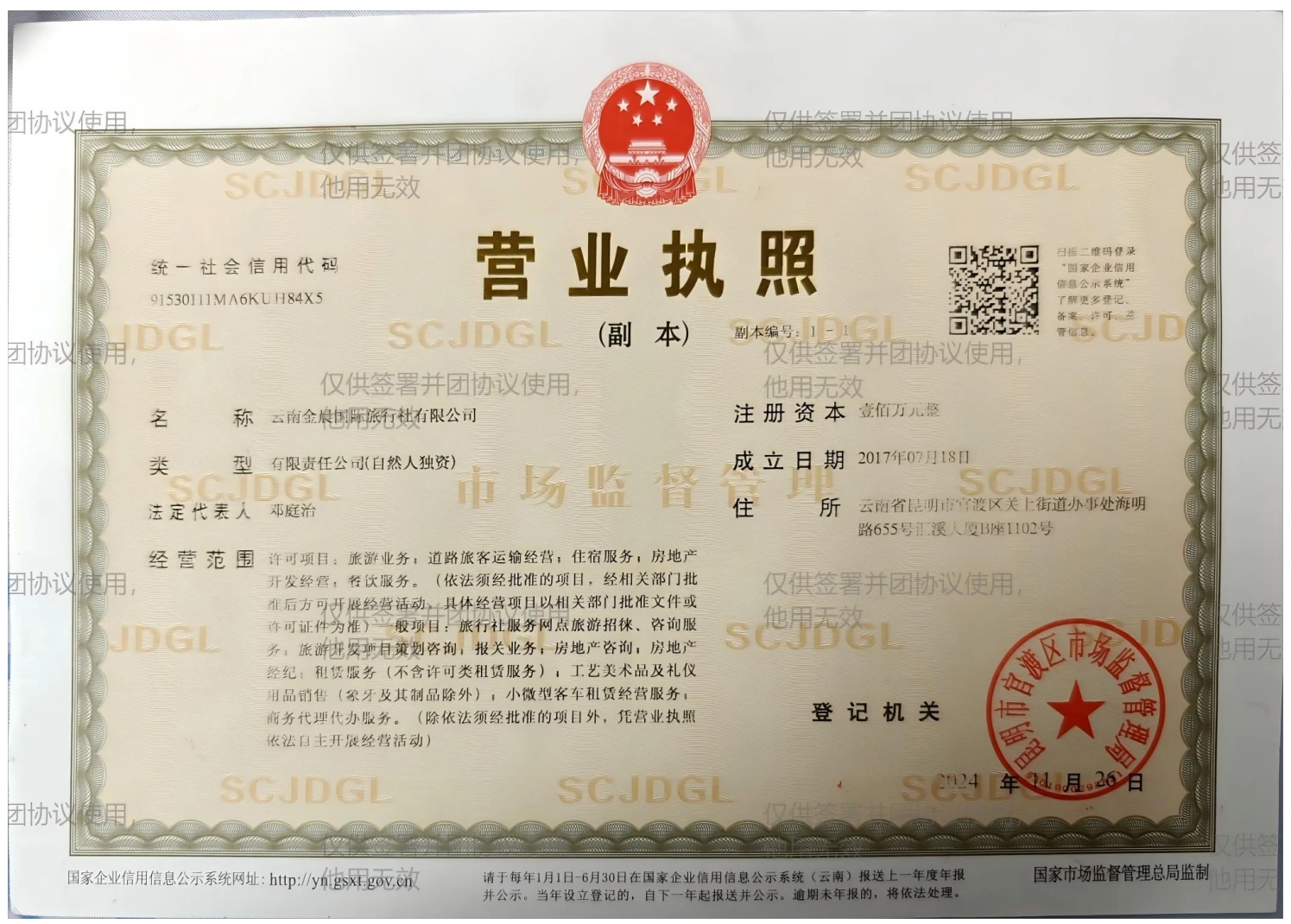 云南金晨国际旅行社有限公司正式获得营业执照!我们致力于为您提供优质的旅行服务,专业的团队、丰富的行程安排,带您探索云南的山水人文、感受多样的民族风情。感谢每一位关注和支持我们的朋友,期待与您一同踏上精彩的旅程!